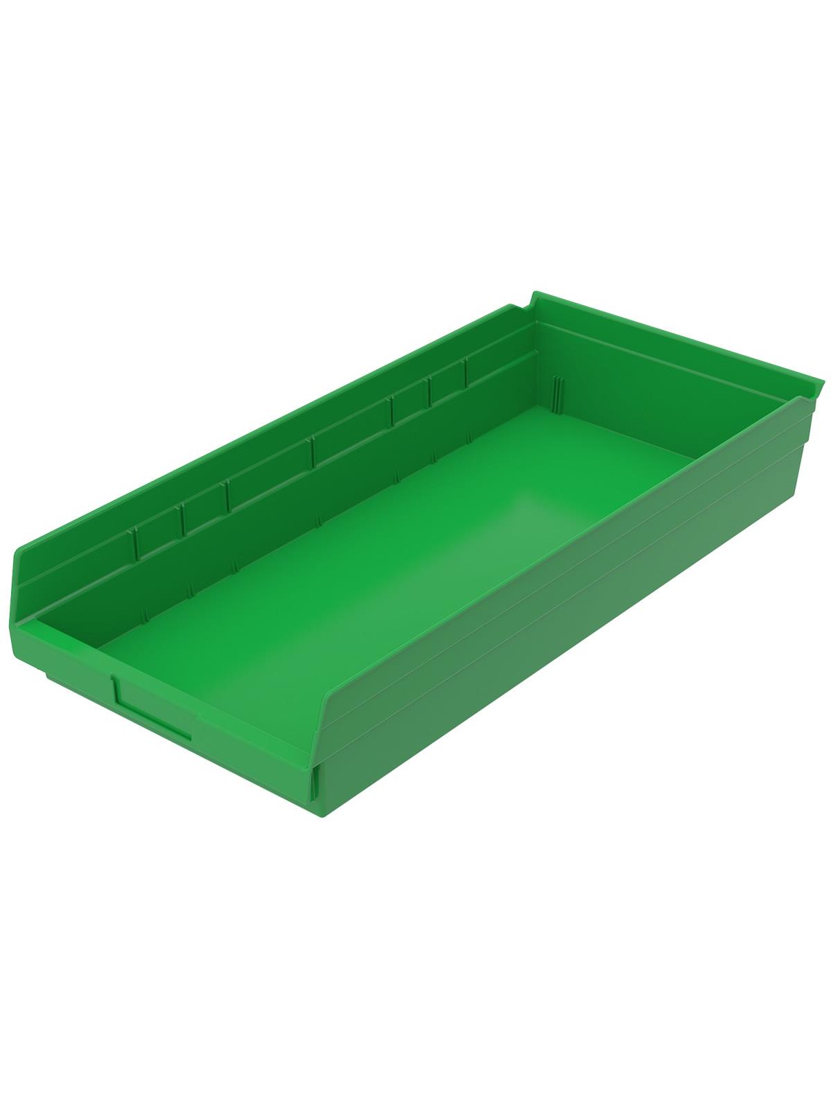 Outlasts corrugated bins - pays for themselves in reduced replacement costs. One-piece construction is waterproof and unaffected by grease or oil. Works with 12", 18" and 24" deep shelving, or vertical storage and retrieval units. Labels available. Available in 22 sizes and five colors - Red, Yellow, Blue, Green, or Semi-Clear. FOB Shipping Point.