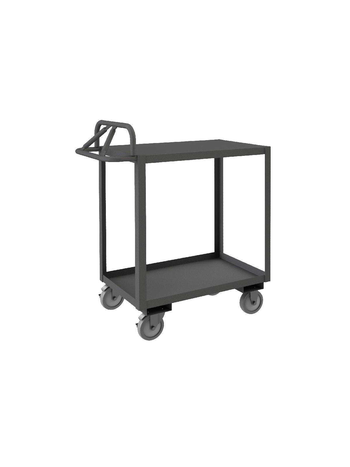 Constructed with 1-1/2" x 1/8" angle iron uprights for added strength. Heavy duty 14 gauge steel shelves. Sturdy, tubular, ergonomic handle has 3 positions ensuring maximum comfort. Standard units have 1-1/2" lips. ALD units have all lips down, TLD units have top lips down. Durable, gray, textured powder coat finish. FOB Shipping Point.