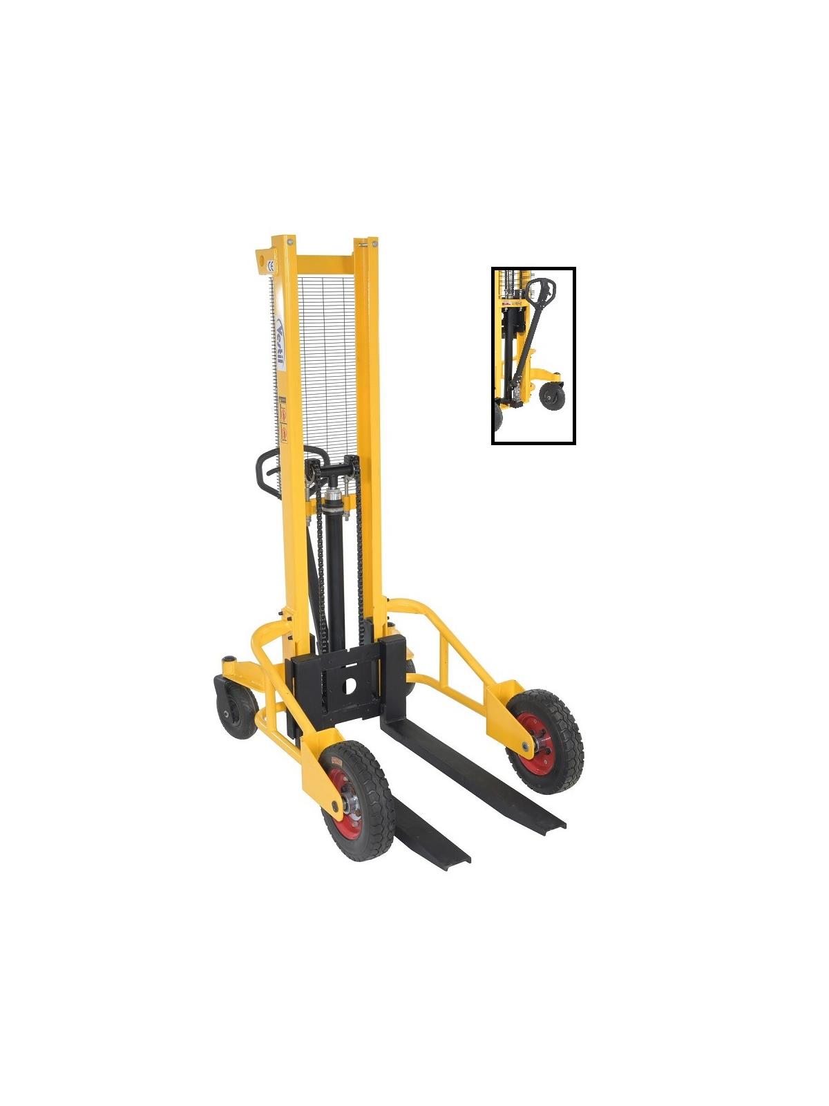 Manual Rough Terrain Stackers are capable of going where other stackers can't. The manual design benefits the user by giving precise movement of the unit in particular areas. A simple handle pump lifts and lowers, without the need for mechanical power. Just a simple hydraulic action leads the forks up or down to the desired height. The rubber tires provide stability when traversing rough or uneven surfaces. Baked in yellow powder coat finish.
