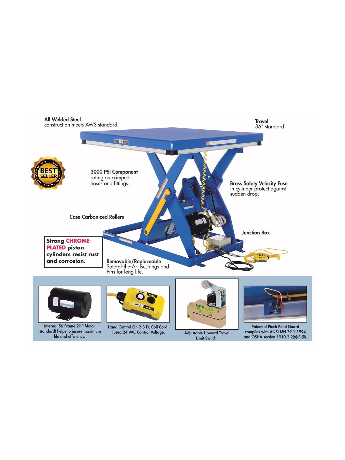 Hardened pins reduce wear. Strong chrome-plated piston cylinders resist rust and corrosion. Cylinder is honed hydraulic tubing. Safety toe guard automatically stops platform if lift comes down on toe or other objects - meets OSHA requirements. Emergency lockup automatically locks platform if hydraulic pressure is inadvertently lost. FOB Shipping Point.