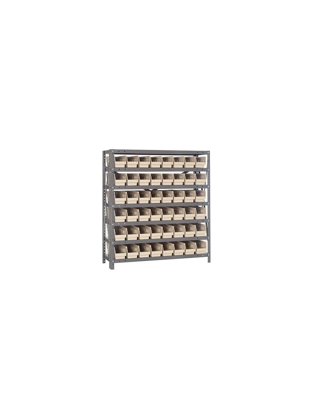 Rugged 350 lb. capacity per shelf, standard shelving unit will keep parts organized and readily accessible. Gray enamel finish will not rust or corrode. 12-HQSB100, 8-HQSB101, 5-HQSB102, 4-HQSB107, 3-HQSB109 fit across a standard 36"W x 12"D shelf. 8-HQSB103, 5-HQSB104, 4-HQSB108, 3-HQSB110 fit across a 36"W x 18"D shelf. Bins are available in Blue, Yellow, Red, Green, Ivory or Black. FOB Shipping Point.