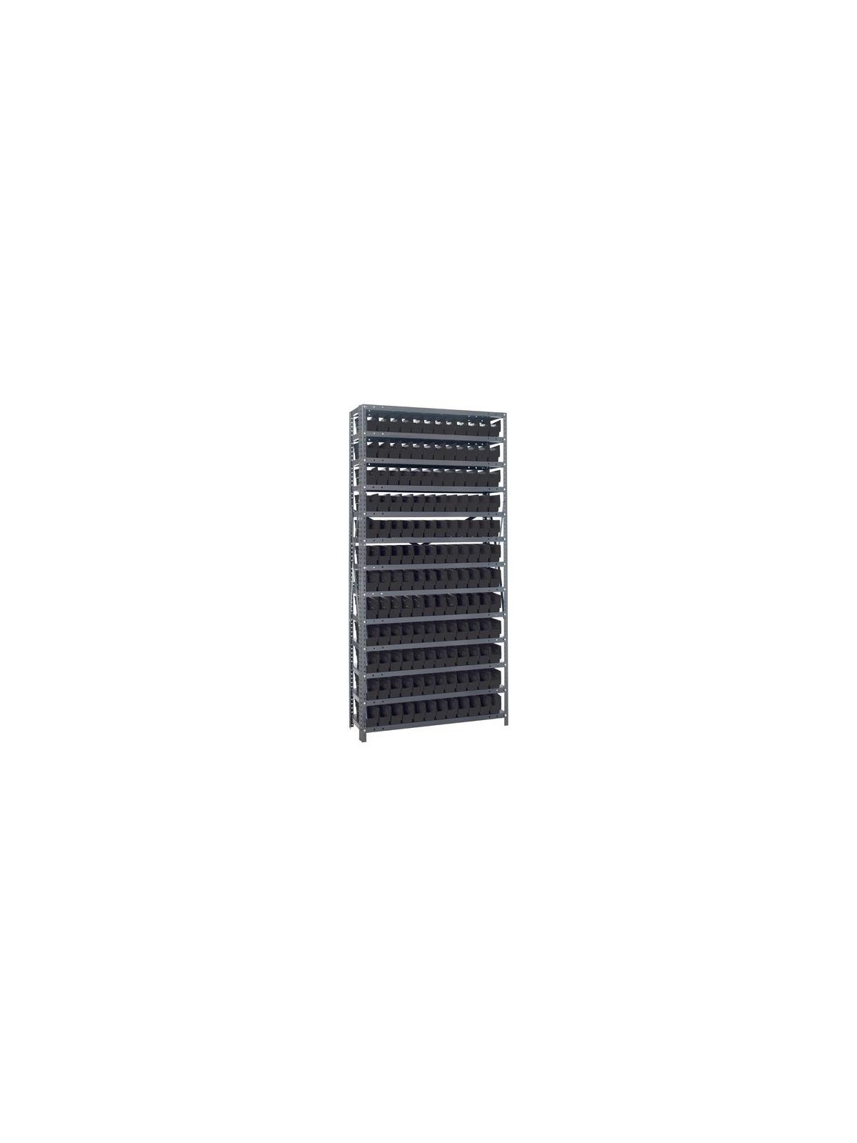 Rugged 350 lb. capacity per shelf, standard shelving unit will keep parts organized and readily accessible. Gray enamel finish will not rust or corrode. 12-HQSB100, 8-HQSB101, 5-HQSB102, 4-HQSB107, 3-HQSB109 fit across a standard 36"W x 12"D shelf. 8-HQSB103, 5-HQSB104, 4-HQSB108, 3-HQSB110 fit across a 36"W x 18"D shelf. Bins are available in Blue, Yellow, Red, Green, Ivory or Black. FOB Shipping Point.