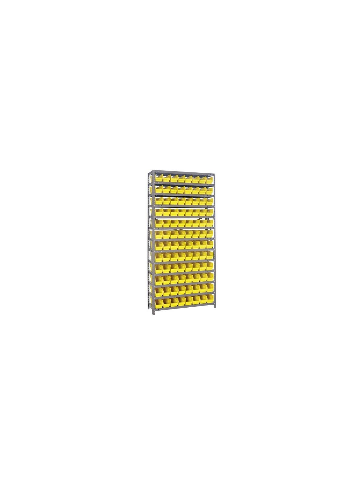 Rugged 350 lb. capacity per shelf, standard shelving unit will keep parts organized and readily accessible. Gray enamel finish will not rust or corrode. 12-HQSB100, 8-HQSB101, 5-HQSB102, 4-HQSB107, 3-HQSB109 fit across a standard 36"W x 12"D shelf. 8-HQSB103, 5-HQSB104, 4-HQSB108, 3-HQSB110 fit across a 36"W x 18"D shelf. Bins are available in Blue, Yellow, Red, Green, Ivory or Black. FOB Shipping Point.
