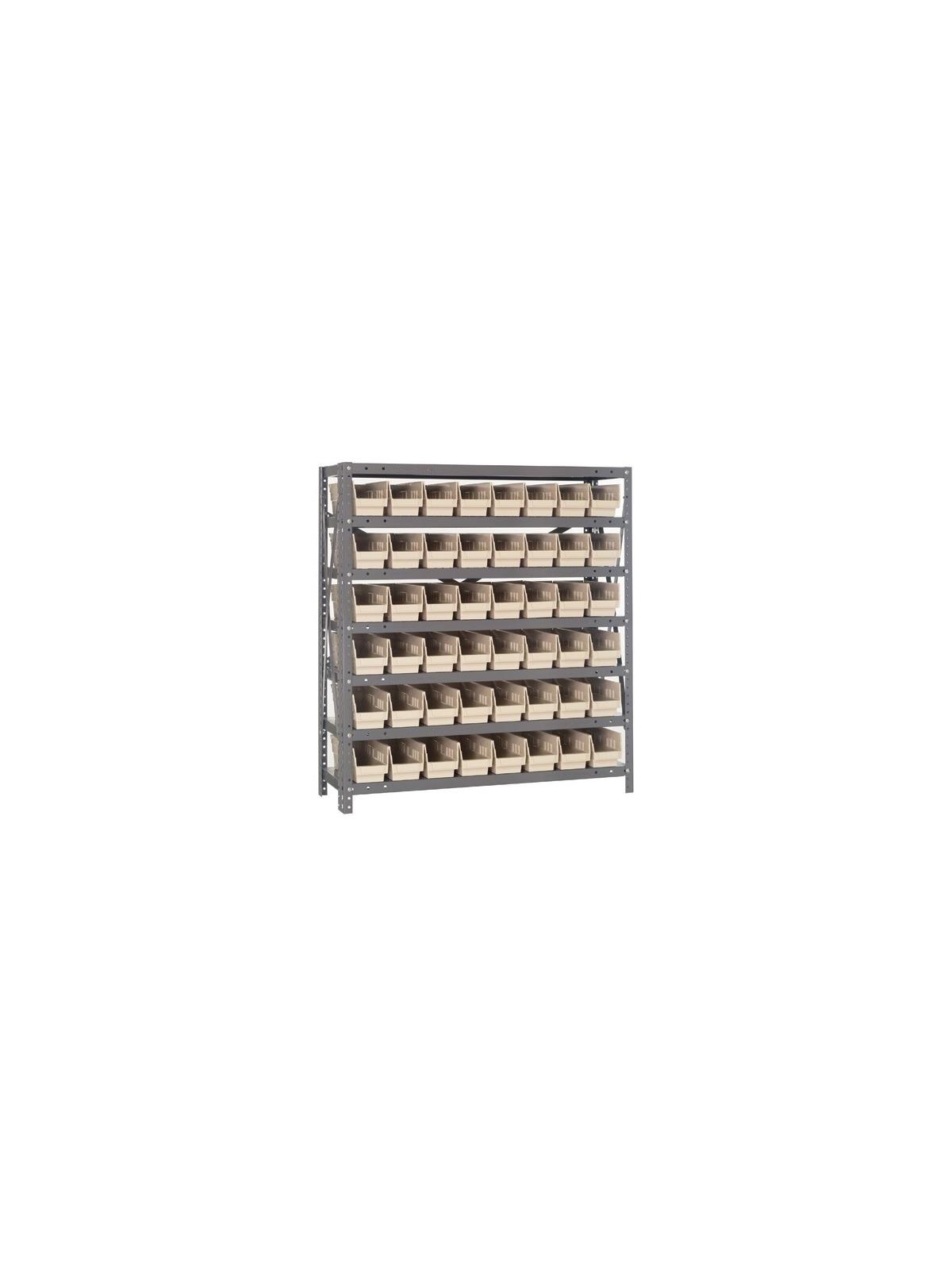 Rugged 350 lb. capacity per shelf, standard shelving unit will keep parts organized and readily accessible. Gray enamel finish will not rust or corrode. 12-HQSB100, 8-HQSB101, 5-HQSB102, 4-HQSB107, 3-HQSB109 fit across a standard 36"W x 12"D shelf. 8-HQSB103, 5-HQSB104, 4-HQSB108, 3-HQSB110 fit across a 36"W x 18"D shelf. Bins are available in Blue, Yellow, Red, Green, Ivory or Black. FOB Shipping Point.