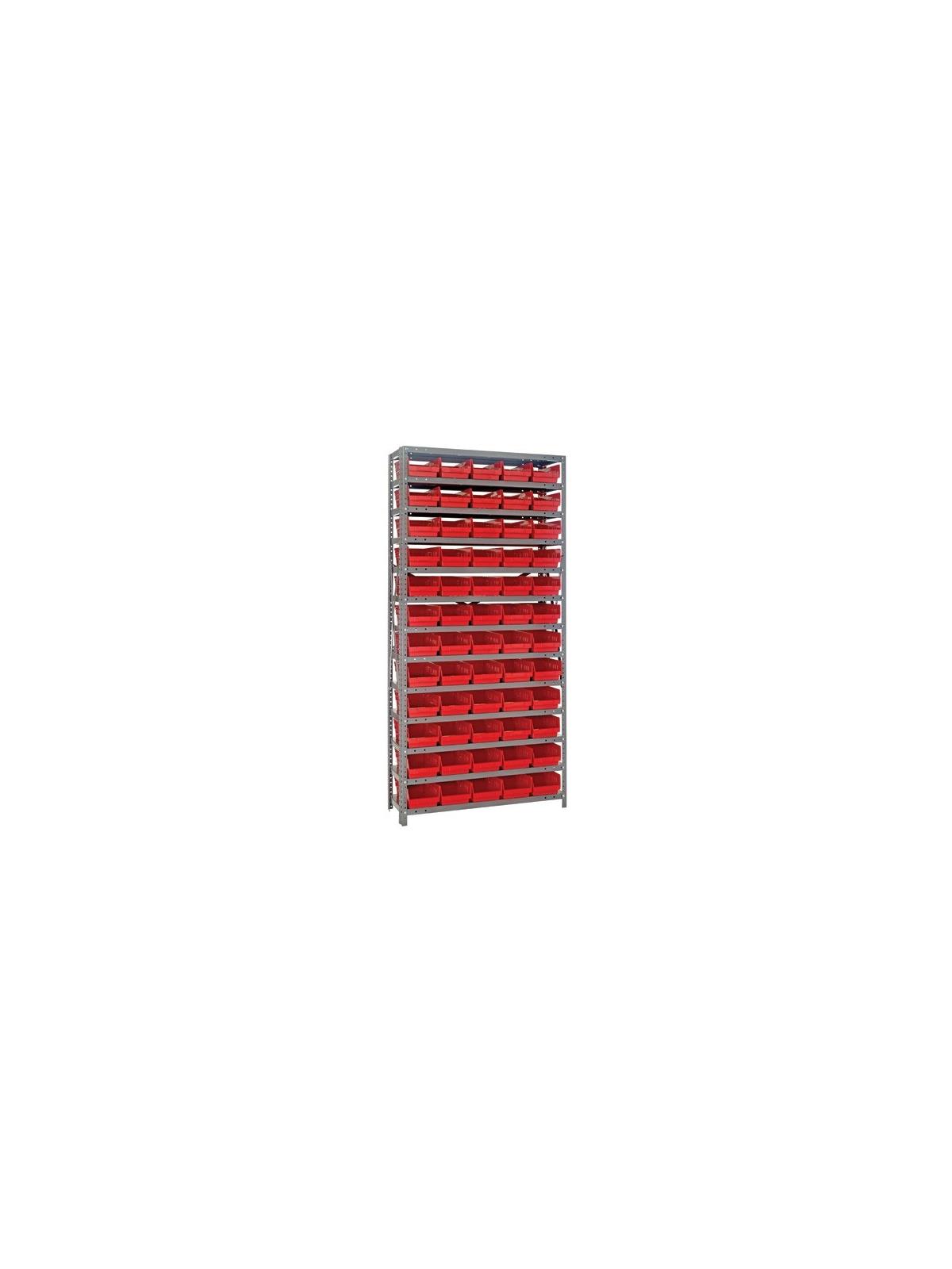 Rugged 350 lb. capacity per shelf, standard shelving unit will keep parts organized and readily accessible. Gray enamel finish will not rust or corrode. 12-HQSB100, 8-HQSB101, 5-HQSB102, 4-HQSB107, 3-HQSB109 fit across a standard 36"W x 12"D shelf. 8-HQSB103, 5-HQSB104, 4-HQSB108, 3-HQSB110 fit across a 36"W x 18"D shelf. Bins are available in Blue, Yellow, Red, Green, Ivory or Black. FOB Shipping Point.