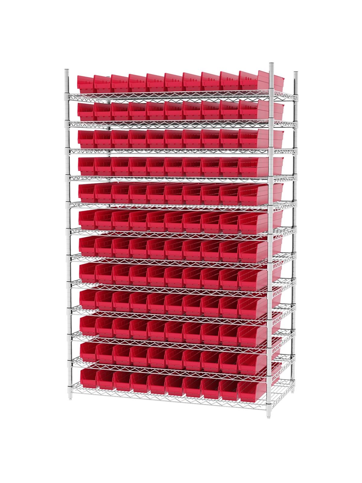 Shelf Bin Wire Systems can be configured for use with 36, 48, 60 or 96 bins providing a versatile system for storage and material handling. Durable and strong polypropylene shelf bins outlast corrugated bins. Bins available in Blue, Red, Yellow, or Semi-Clear. FOB Shipping Point.