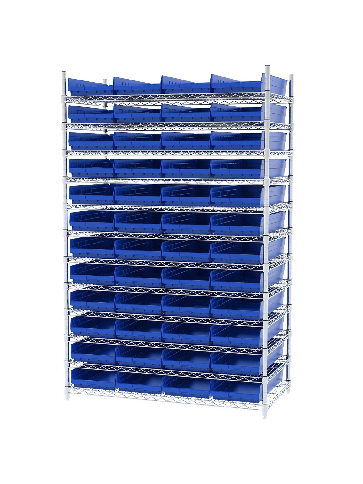 Shelf Bin Wire Systems can be configured for use with 36, 48, 60 or 96 bins providing a versatile system for storage and material handling. Durable and strong polypropylene shelf bins outlast corrugated bins. Bins available in Blue, Red, Yellow, or Semi-Clear. FOB Shipping Point.
