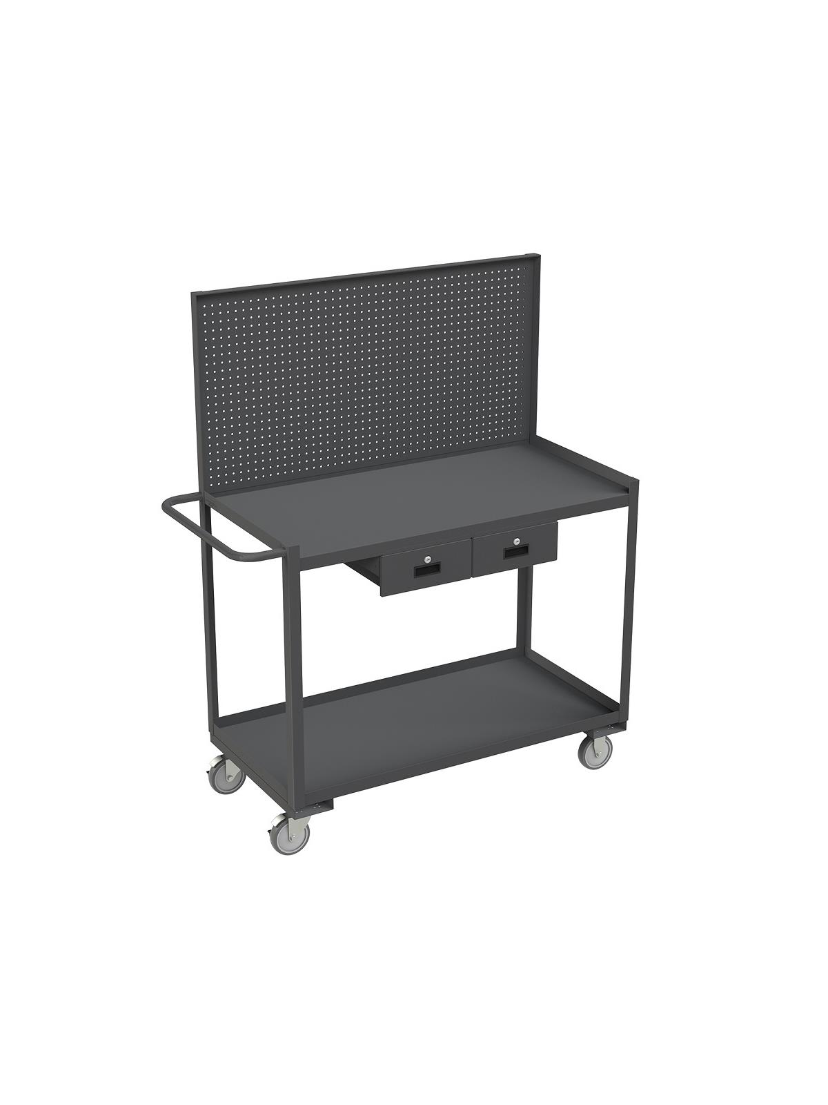 Frame is 1-1/2 x 1/8" angle iron for added strength. Rolls smoothly on 5" polyurethane bolt-on casters, (2) swivel with side brakes and (2) rigid. 1200 lbs. capacity. Pegboard holes are 1/4" diameter and punched on 1" centers. They accommodate standard peg hooks. (peg hooks are not included.) Louvered panels accommodate Hook-On-Bins®. 32 Hook-On-Bins® are included. Bin size is 4" x 7" x 3". Locking drawers, include locks and 2 keys. FOB Shipping Point.