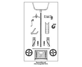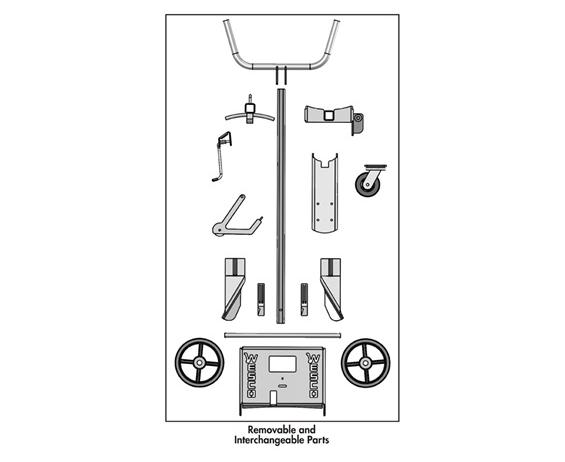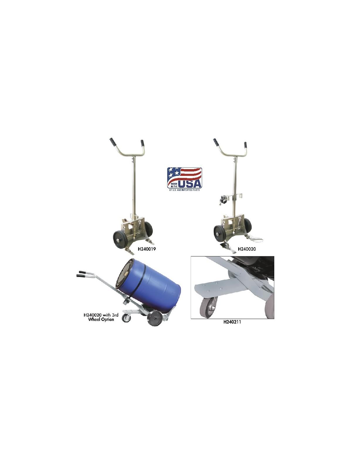 Two models to choose from. H240019 handles steel drums and includes replaceable stainless milled toes. H240020 handles poly drums and includes replaceable stainless feet. Each model includes handle, frame, base, kickstand, axle, wheel and chime hook. H240020 also includes a stainless belt buckle. All parts are removable and interchangeable among all models. Rolls smoothly on 10" Polyolefin wheels. Foot operated break-over assist bar provides extra leverage to tilt and balance the load. Optional Third Wheel swivel caster allows your load to stand in a tilted position with an ergonomic design allowing for better load support. FOB Shipping Point.