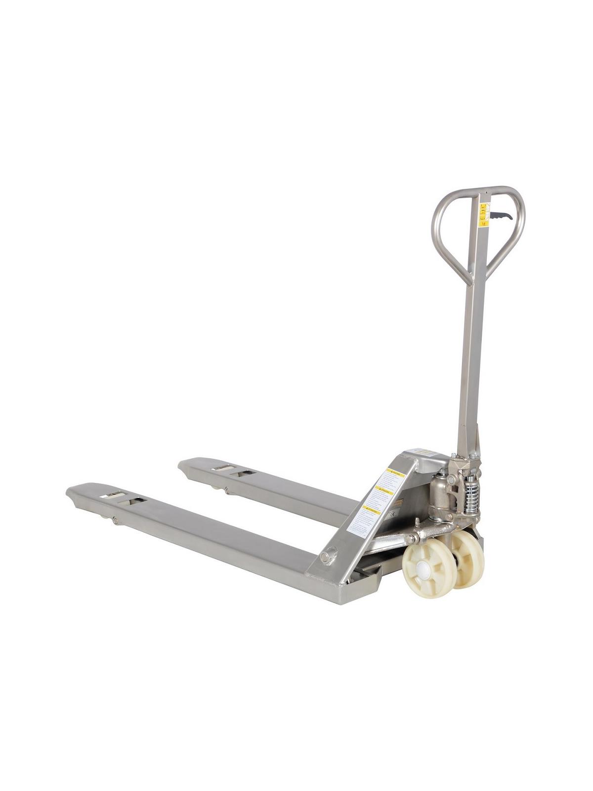 Choose either 304 stainless steel frame and forks or entirely 304 stainless steel pallet truck for long life in even the most harsh environments. Fork size: 27"W. x 48"L. Service range is 2-7/8" to 7-3/4". FOB Shipping Point.