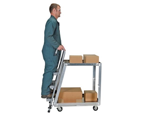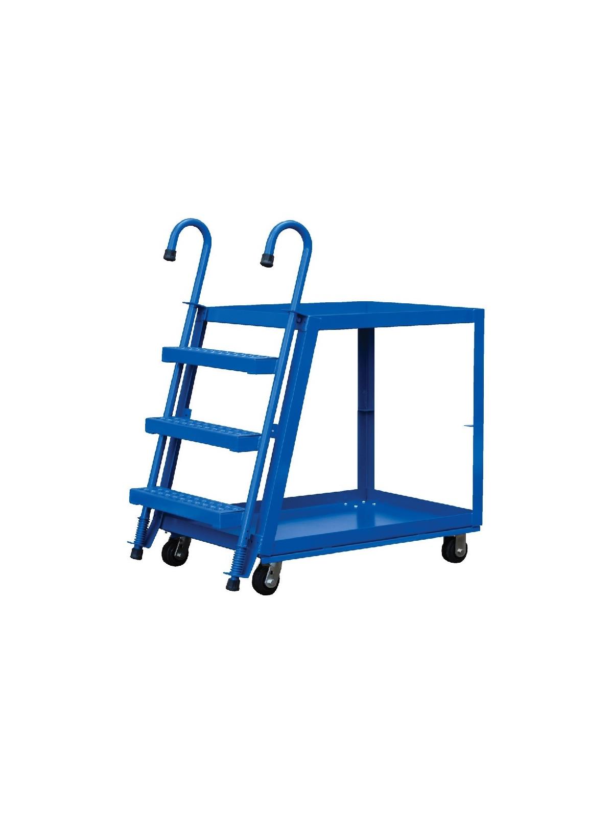 Stockpicker Trucks combine the mobility of a cart with the versatility of a steel step ladder. Spring loaded steel step ladder holds the cart securely in place while a person is standing on the ladder. Shelves have a 2" lip turned up. 4" x 1-1/2" mold-on rubber casters two (2) rigid and two (2) swivel with wheel brakes. Blue baked-in powder-coat finish for added toughness. Aluminum construction available. FOB Shipping Point.