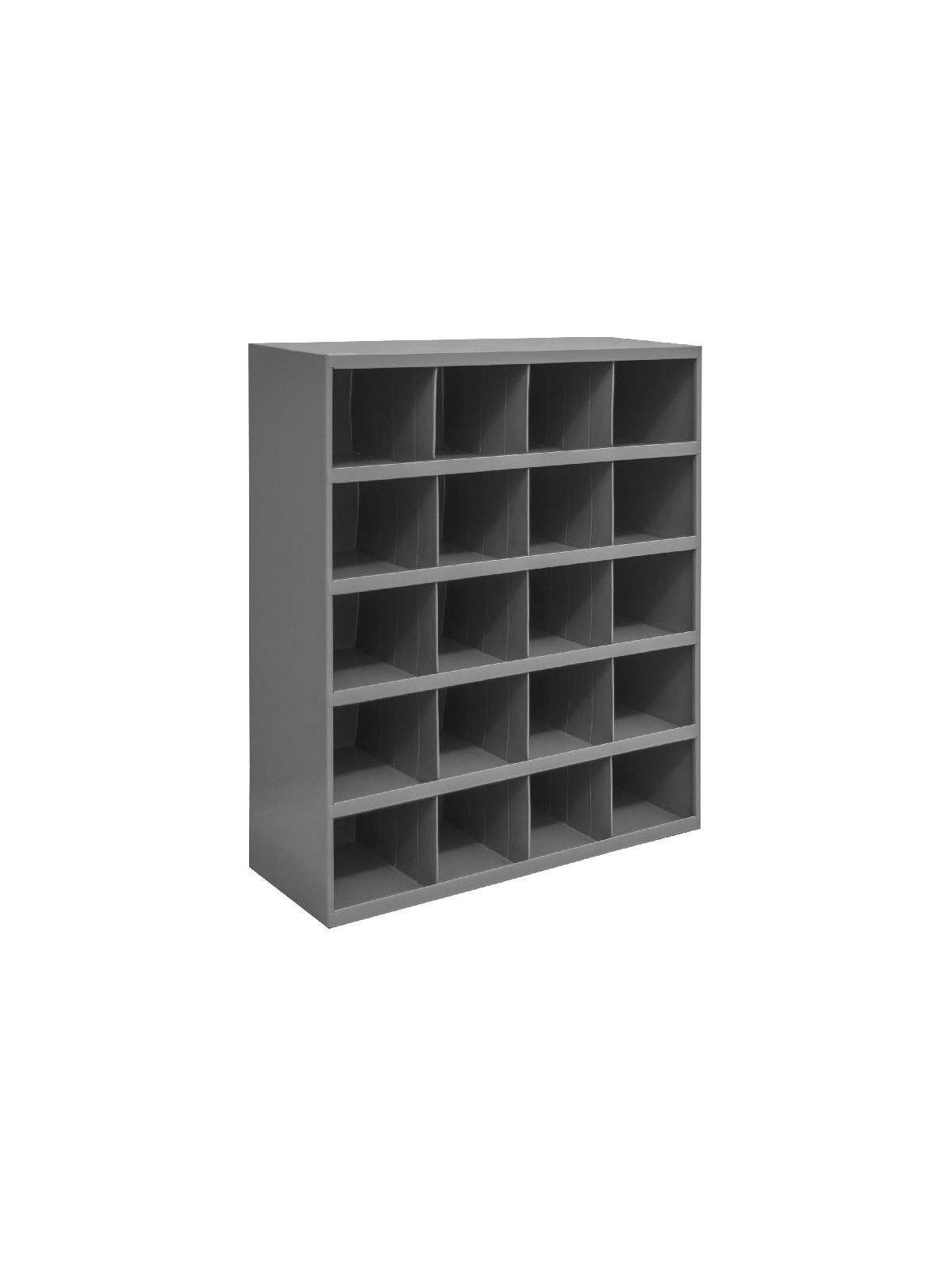 Roll-formed sides for increased strength and stability. Newly redesigned slope shelves. Ribbed and hemmed dividers provide added strength. Optional base available. Ships fully assembled ready for use. Durable gray powder coat finish. FOB Shipping Point.