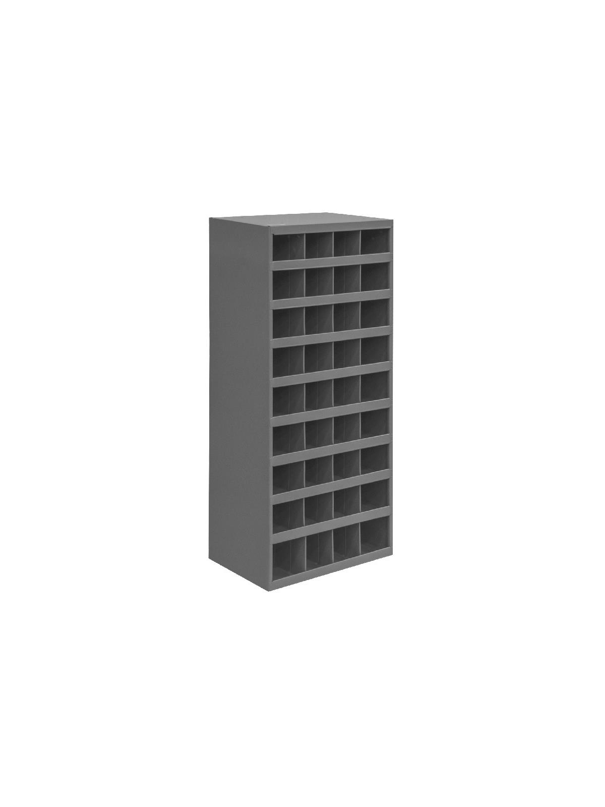 Roll-formed sides for increased strength and stability. Newly redesigned slope shelves. Ribbed and hemmed dividers provide added strength. Optional base available. Ships fully assembled ready for use. Durable gray powder coat finish. FOB Shipping Point.