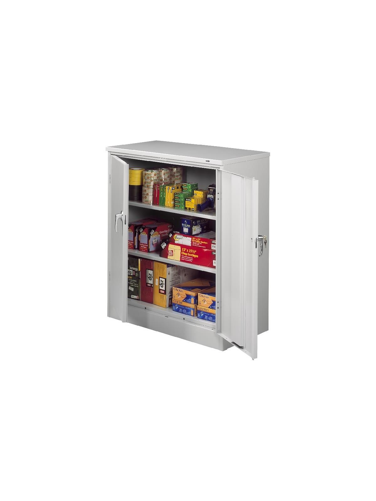 Knuckle hinges on each door insure the integrity of the cabinet and the alignment of the doors. Doors are reinforced for strength and quietness. Handle on right-hand door activates a 3-point system for added security; dummy handle on left-hand door. Shelves are adjustable in 2" increments on built-in shelf tabs. Shelves will hold up to 200 lbs. evenly distributed. Two front leveling glides compensate for uneven floors. Louvered back panel allows air circulation in the cabinet. Available in four models--storage, wardrobe, combination, and counter high cabinets. Available in Black, Champagne/Putty, Sand, Light Gray and Medium Gray. FOB Shipping Point.
