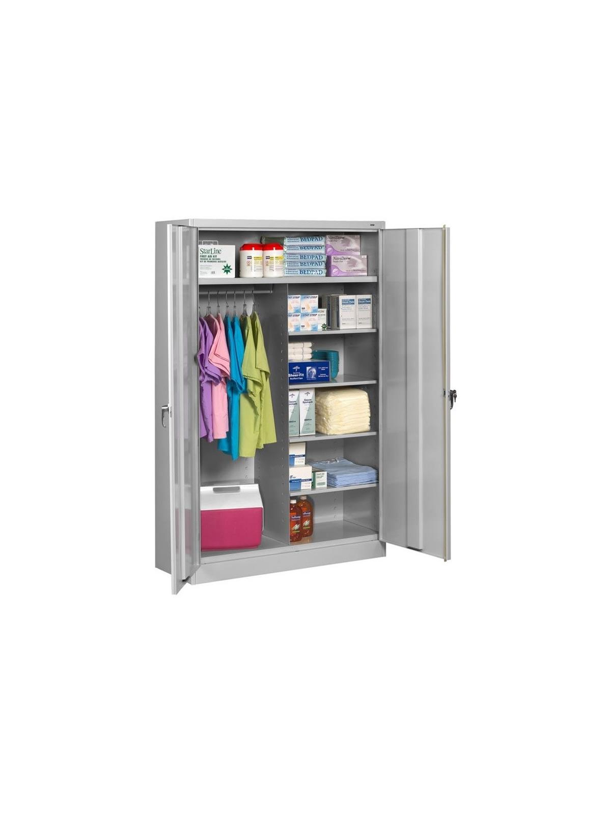 Jumbo size for jumbo storage capacity. Two front leveling glides compensate for uneven floors. Four leaf hinges on each door insure the integrity of the cabinet and the alignment of the doors. Handle on right-hand door activates a three-point locking system for added security -- second handle on left-hand door. Shelves are adjustable in 2" increments on built-in shelf tabs. Shelves hold up to 400 lbs. evenly distributed. Unassembled cabinets ship in 2 cartons. Available in Black, Champagne/Putty, Sand, Light Gray and Medium Gray. FOB Shipping Point.