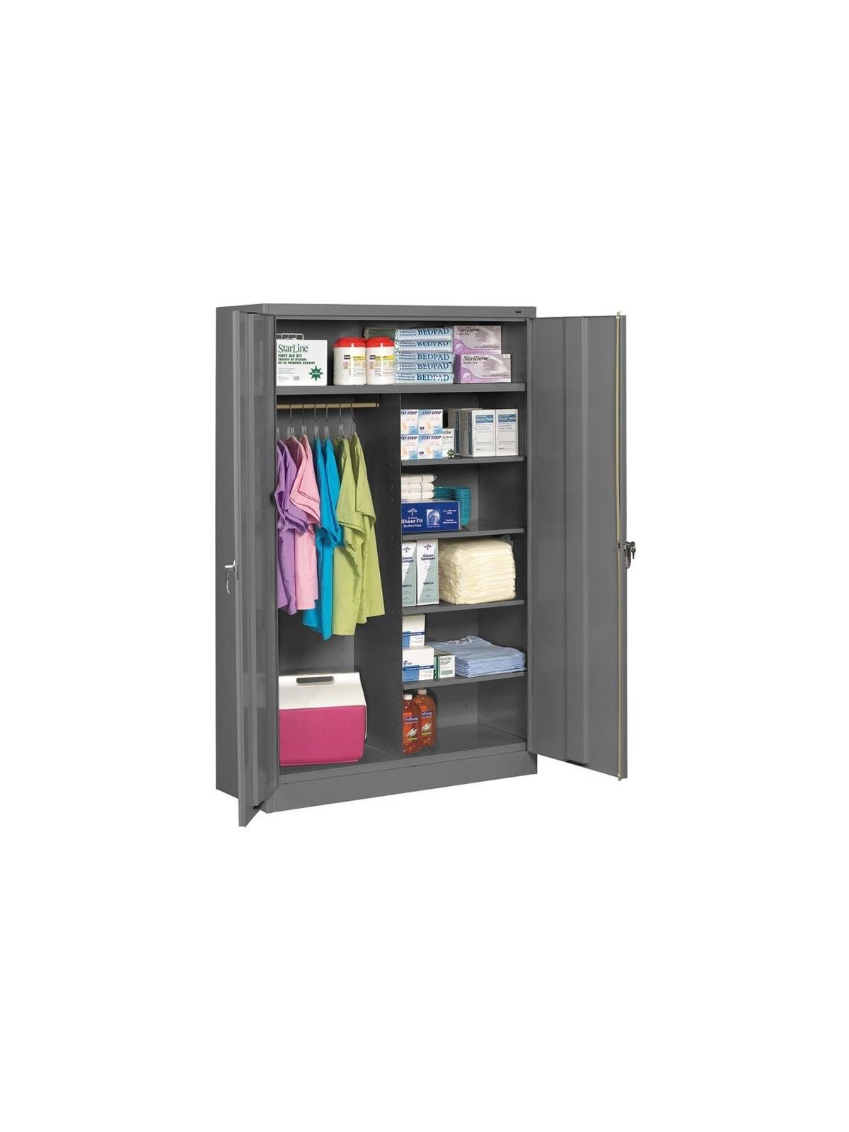 Jumbo size for jumbo storage capacity. Two front leveling glides compensate for uneven floors. Four leaf hinges on each door insure the integrity of the cabinet and the alignment of the doors. Handle on right-hand door activates a three-point locking system for added security -- second handle on left-hand door. Shelves are adjustable in 2" increments on built-in shelf tabs. Shelves hold up to 400 lbs. evenly distributed. Unassembled cabinets ship in 2 cartons. Available in Black, Champagne/Putty, Sand, Light Gray and Medium Gray. FOB Shipping Point.