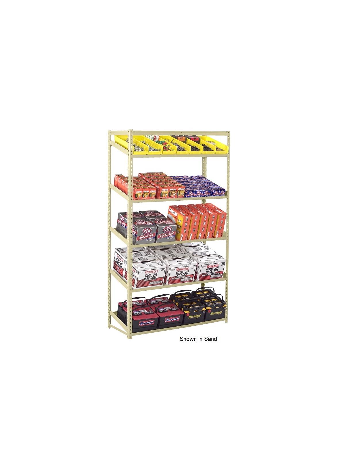 Parts, bins and boxes slide forward for easy picking. Open access from all sides. Place back to back to double shelf depth. Canopy top has box formed construction. Features 2" side flange to retain product. 1/2" front lip acts as a product stop. Heavy gauge shelf supports. Shelves support up to 450 lb. loads. Boltless construction - easy assembly with only a mallet. 5 sloping steel shelves per unit. 18"D. shelves slope 12 degrees. 24"D. shelves slope 14 degrees. Starter unit can be used individually or combined with adder units to form a row of shelving. Medium Gray or Sand finish. FOB Shipping Point.