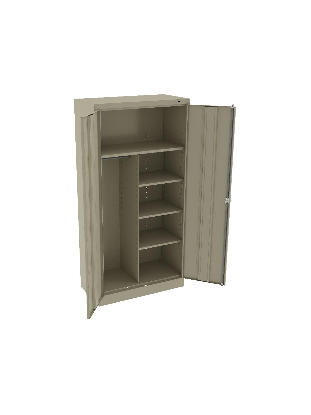 Shelves adjust in 2" increments. Heavy-steel construction with leaf hinges and reinforced doors stand up to a lifetime of heavy use. Handle on right-hand door activates the three-point locking system to keep belongings secure. Raised base keeps contents from contacting moisture from the floor. Available in 3 models--storage, wardrobe and combination. Available in Black, Champagne/Putty, Sand, Light Gray and Medium Gray. FOB Shipping Point.