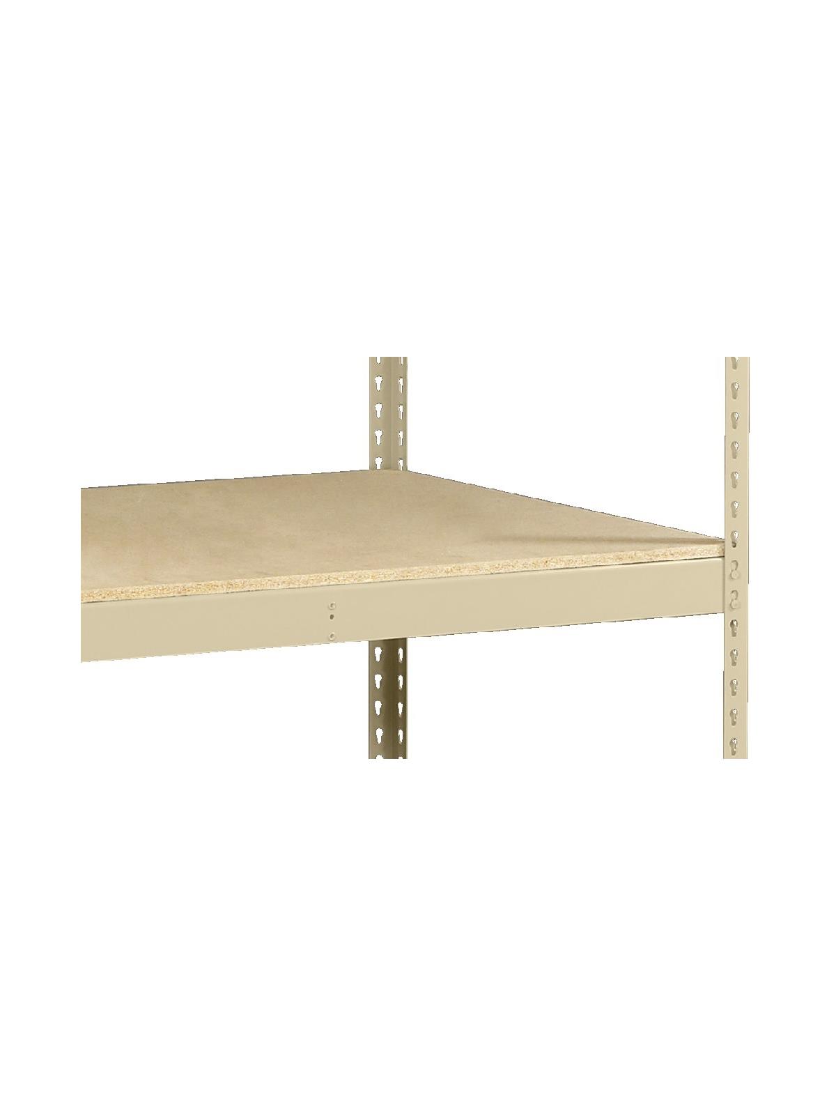 Built with double-rivet design and keyhole slots to form a rigid framework. Heavy 14 gauge steel posts and shelf supports deliver a system that stands up to rugged use. Assembles easily and quickly with only a rubber mallet. The rivet and keyhole design eliminates the need for clips, gussets, or sway braces and allows access to the shelves from all sides of the unit. Wide profile 2-3/4"H angle shelf supports handle loads from 1600-2250 lbs. per shelf, depending on shelf size. Shelves are supported on all 4 sides in addition to having front-to-back center supports. The units have 3 shelf levels (2 openings). Buy the unit with 5/8" particle board decking. Available in Sand or Medium Gray, specify in comments when ordering. FOB Shipping Point.