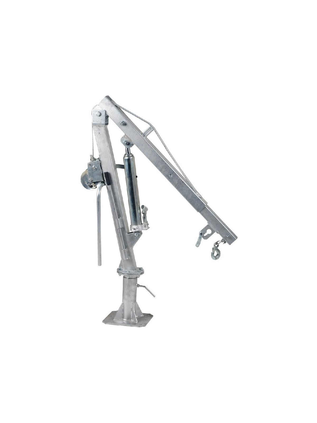 Includes telescopic boom design with manual hydraulic hand pump to pivot boom up and down. Manual cable winch to lift and lower loads. Unit comes with one fixed hook, one chain slot lock, and one cable hook with latch. DC powered option available. FOB Shipping Point.