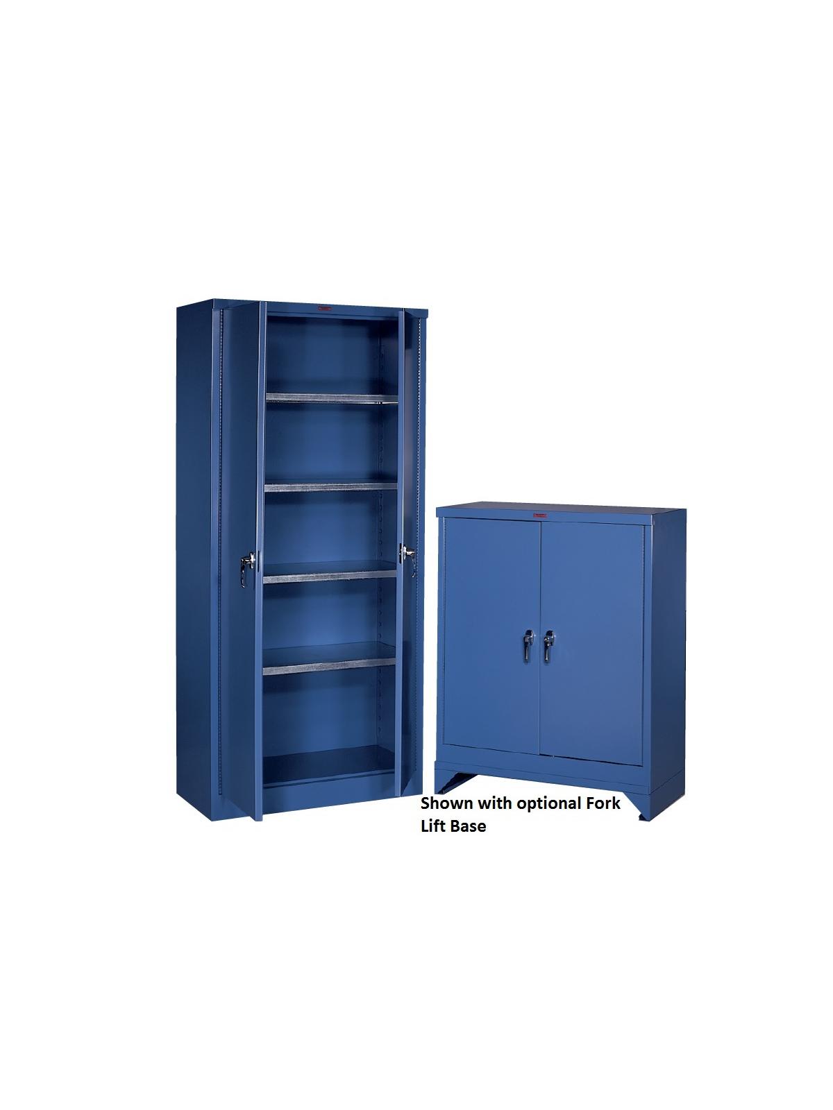 The toughest cabinet built! Designed for extra heavy and extra rough use. Galvanized shelves for a long lasting durable finish­ -- scratch, oil and chemical resistant. 800 lb. shelf capacity. Finish is high visible precaution blue which is an electrostatically applied powder coated finish. FOB Shipping Point.