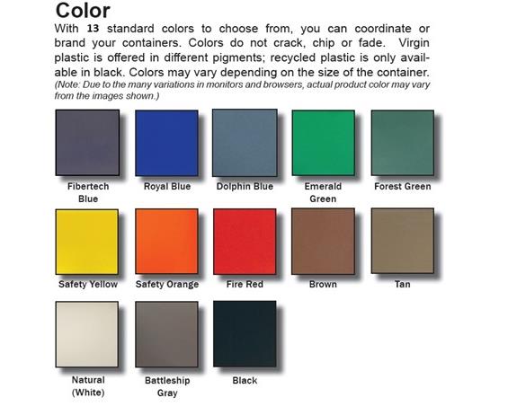 Fibertech Recycling Carts are made of high-impact rotationally molded Polyethylene providing you a light weight, durable solution to your recycling containment. Our commercial recycling bins promote compliance while providing a reliable, durable solution in a broad range of industries such as Healthcare, Manufacturing, Distribution or Government. Custom options and volume discounts available. Specify color when ordering. FOB Shipping Point.